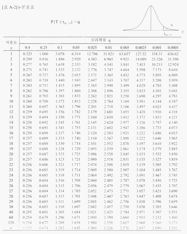 정규분포표와는 다르게 자유도와 확률로 구성된 t-분포표이다.