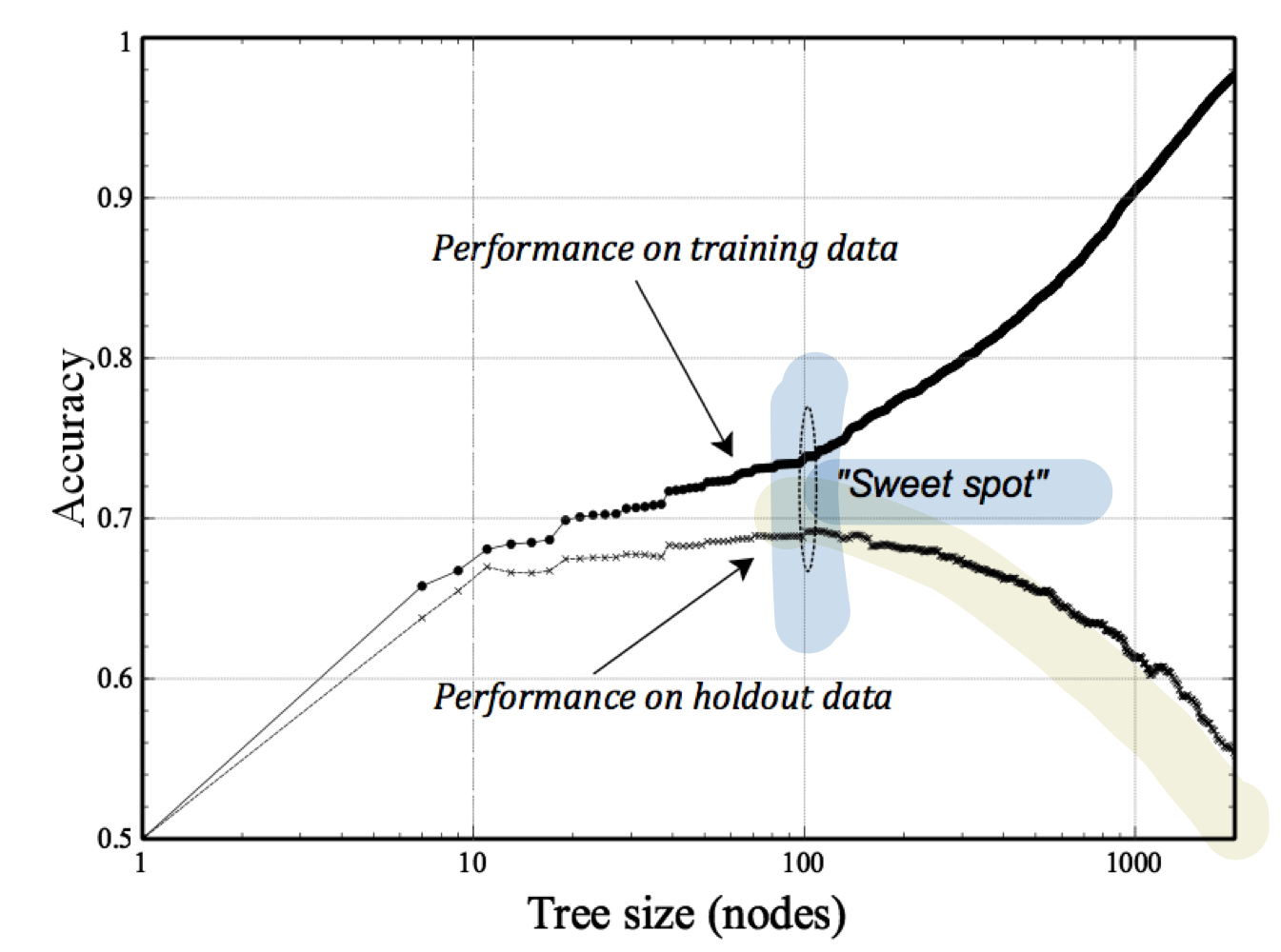 - holdout data의 정확도가 떨어지는 순간 (= overfit이 시작되는 순간) 을 "sweet spot" 이라고 한다.