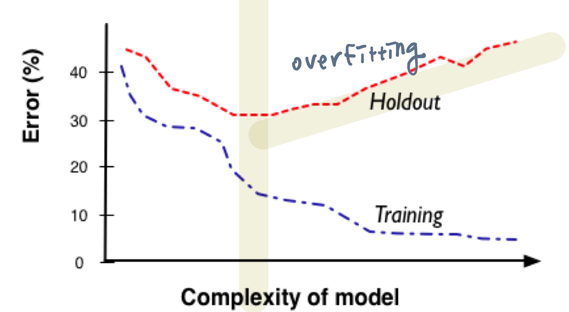 - 모델이 너무 복잡해질 때 : 훈련데이터에서는 정확도가 높아진다. 하지만, 테스트 데이터에서는 정확도가 낮아진다. → overfitting