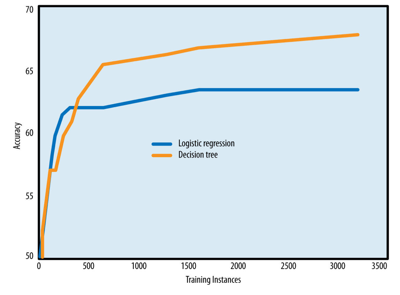 - learning curve : tree와 logistic regression에서 훈련 데이터 크기에 따른 일반화 성능을 나타낸 그래프이다.