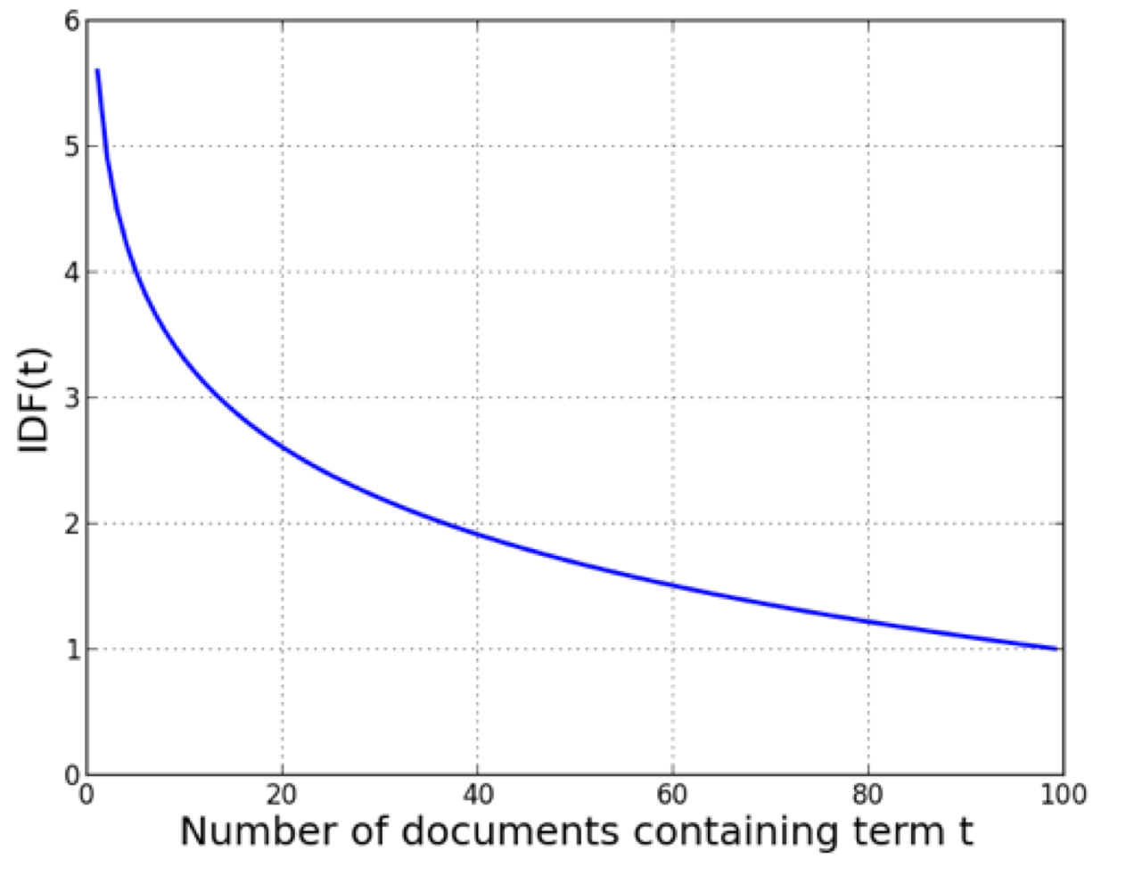 - t를 포함한 문서가 많을수록 IDF는 1에 수렴한다.