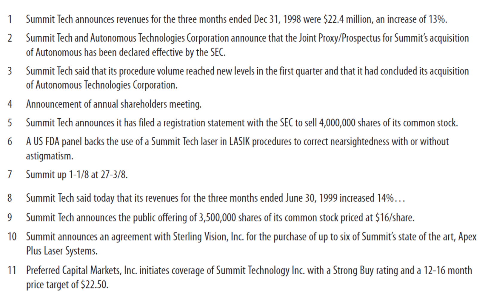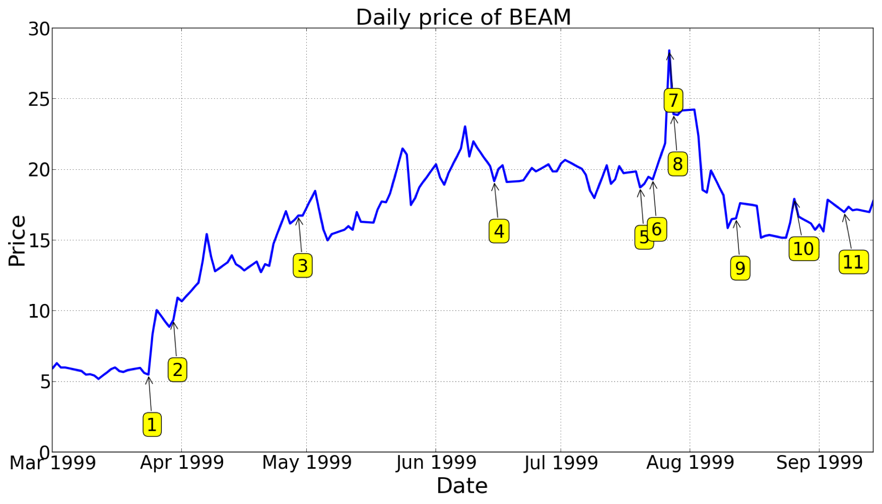 - 숫자로 표시된 각 지점에 주가가 오르고 내렸는데, 각 지점마다 회사 관련 뉴스가 있었다.