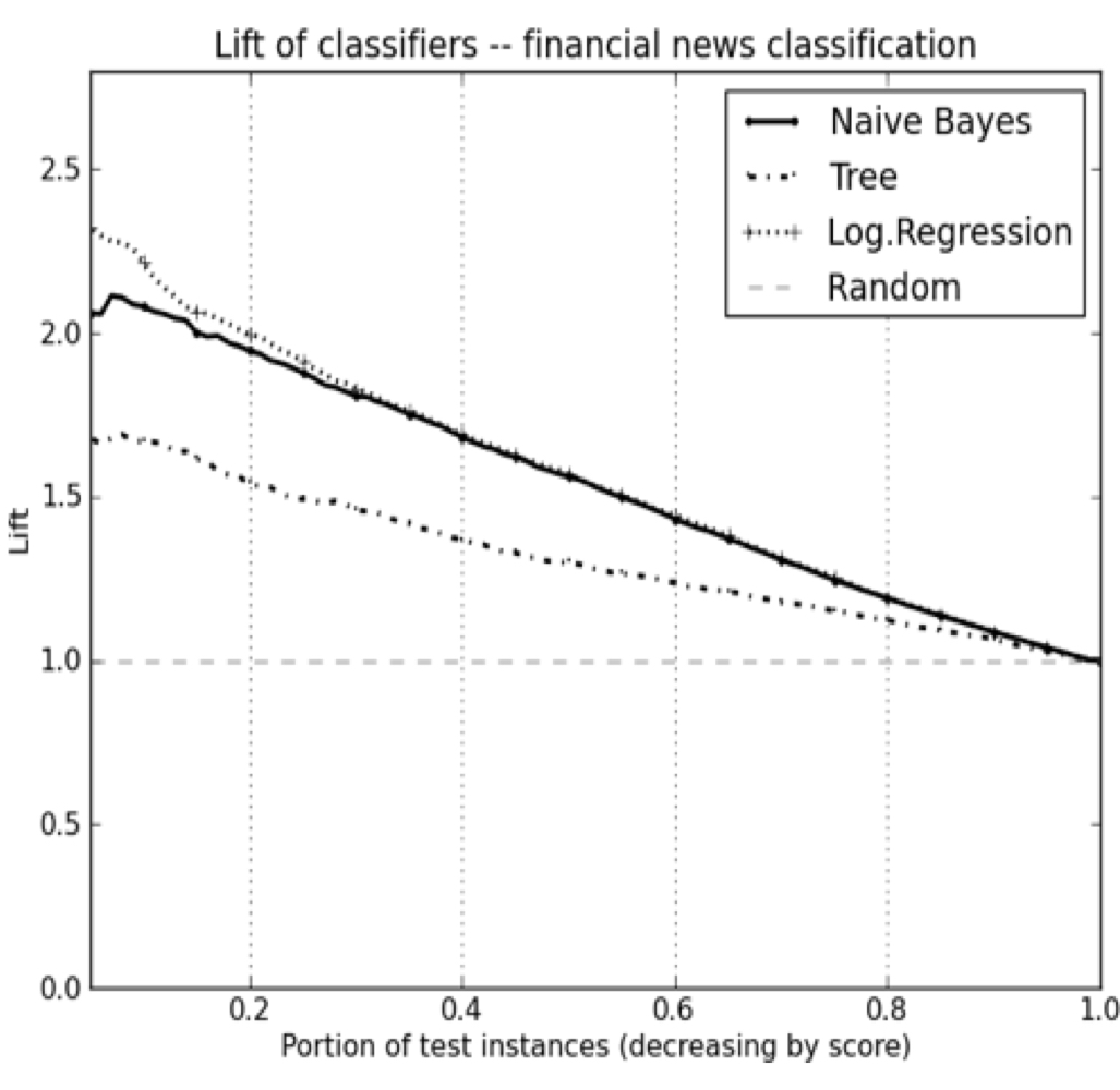 - 이는 만약 모든 뉴스 기사의 점수를 매기고 상위 20%만 선택했다면, positive 뉴스는 랜덤으로 예측된 것보다 2배의 정밀도를 보인다.