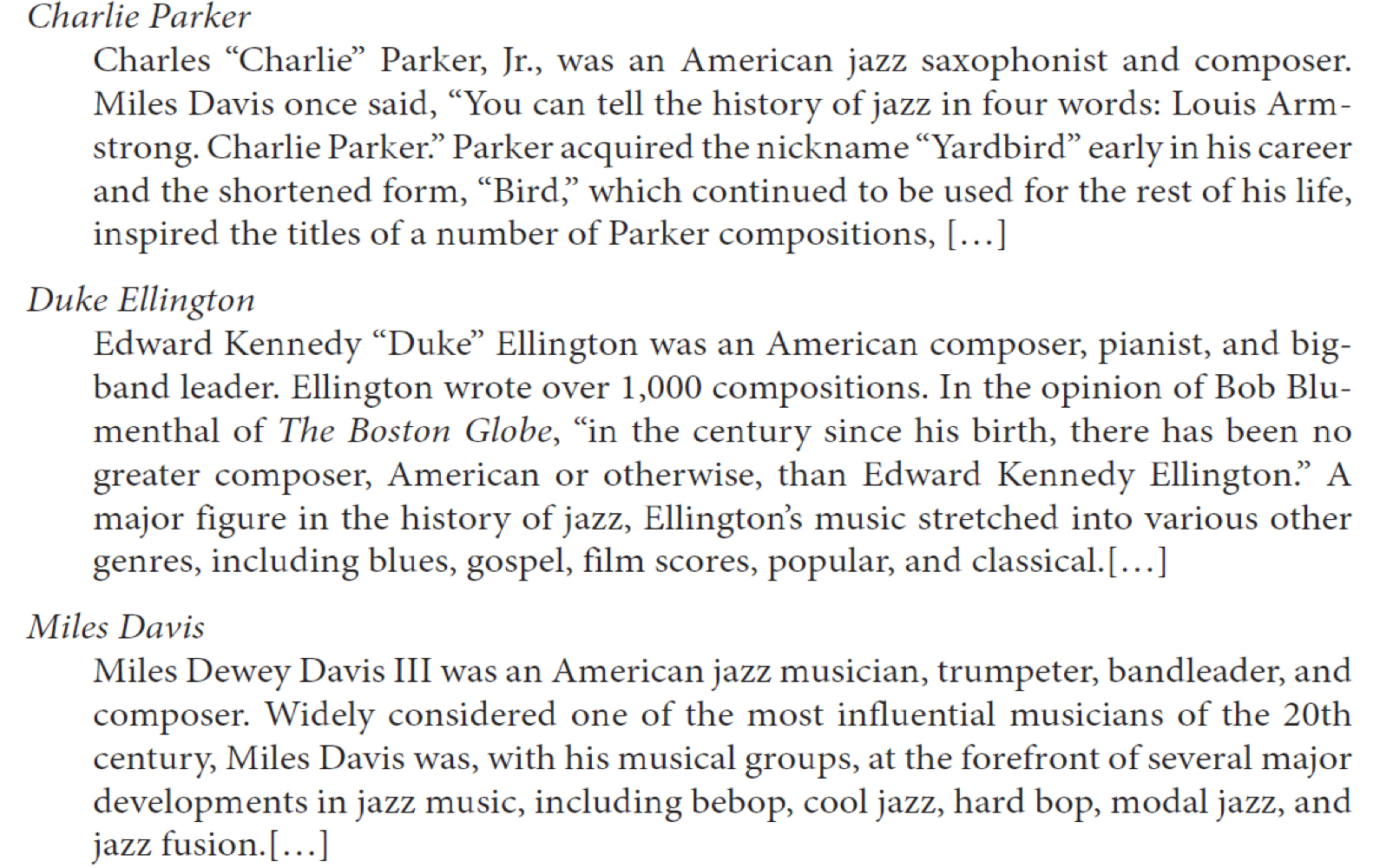 - 위키피디아에서 15명의 유명한 재즈 음악가, 전문가들의 전기를 가져온 것이다.