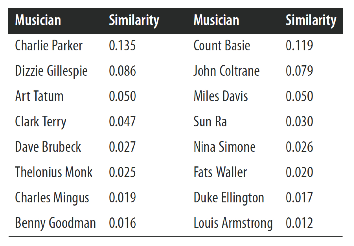 - 유사도 결과를 보면 실제 예제에 해당하는 음악가인 'Charlie Parker'와의 유사도가 가장 큰 것을 볼 수 있다.