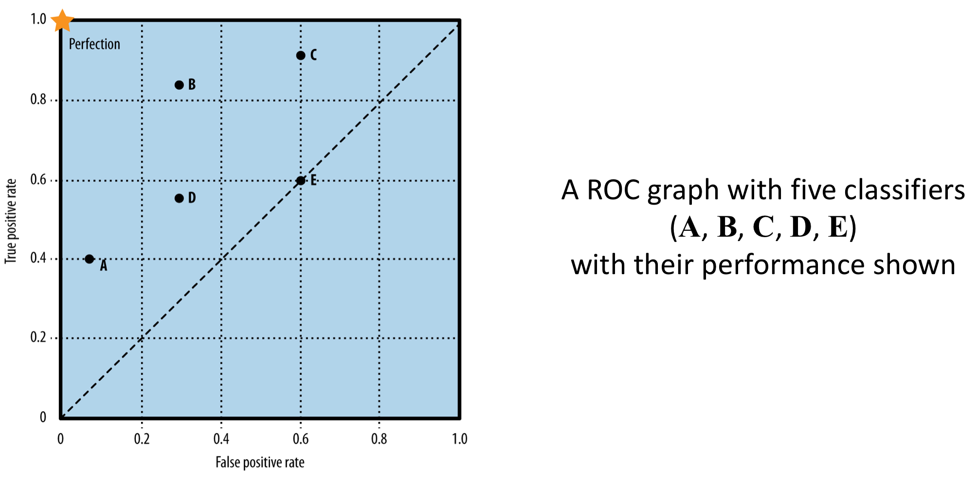 - 각 점 (fpr, tpr) 은 classifier 한 개를 나타낸다.