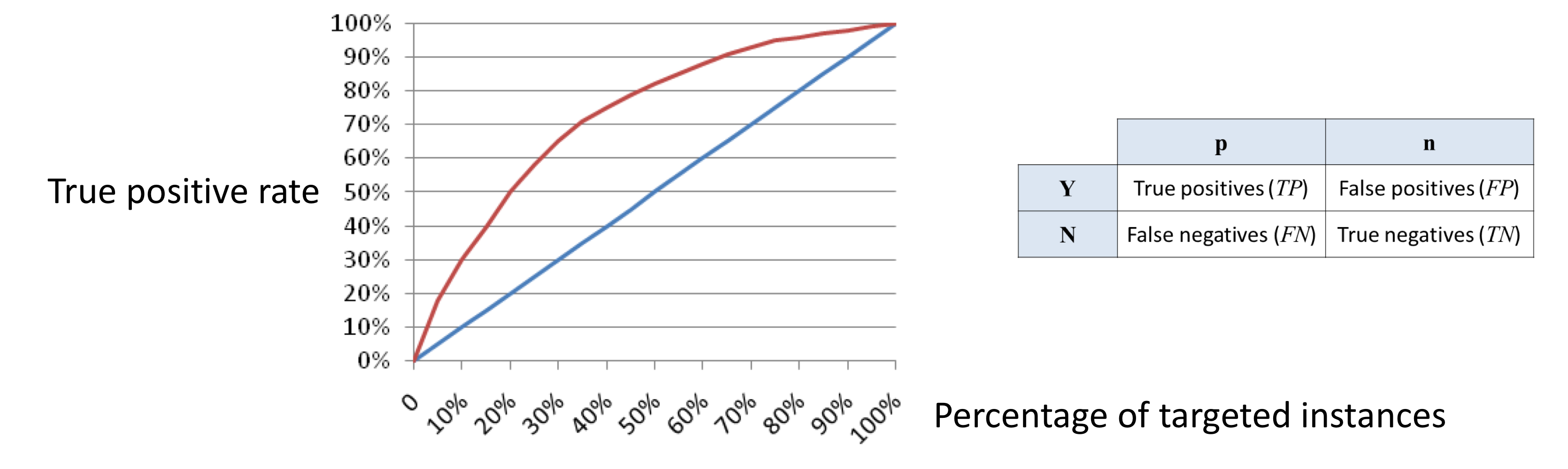 - A better model : x%를 타겟으로 할 때 x%보다 큰 positives를 얻는다.