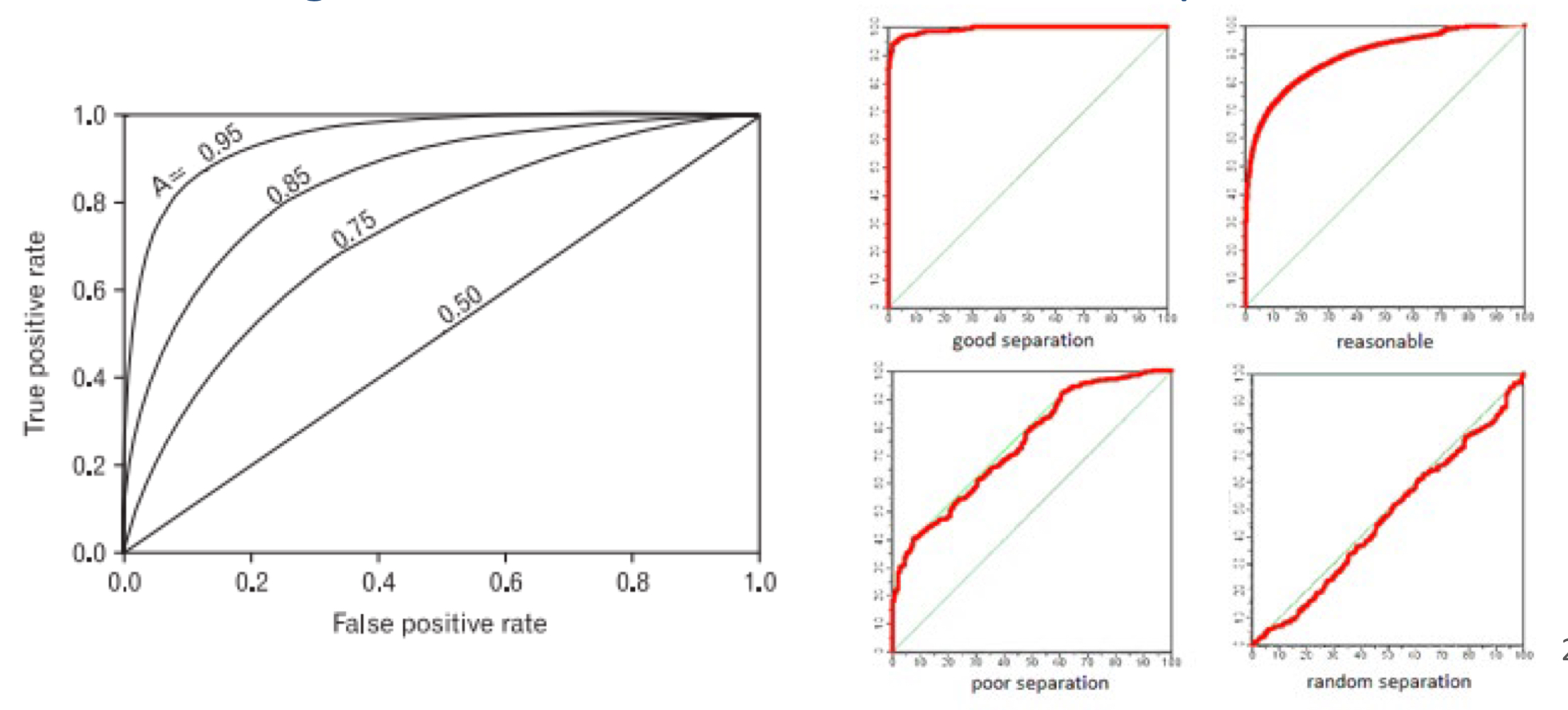 - 왼쪽 그래프에서 숫자가 AUC이며 classifier의 성능을 나타낸다. 0.95는 0.85보다 10% 더 좋은 성능을 갖는다는 것이다.