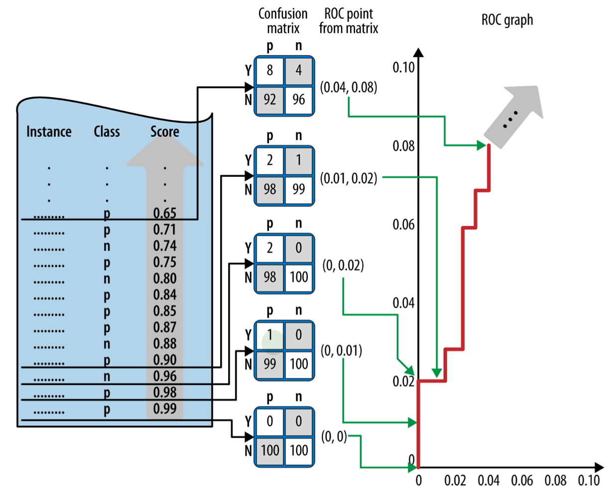- 하지만, 그 사이에서는 classifier가 고객을 정렬한 방법에 따라 서로 다른 값을 갖는다.