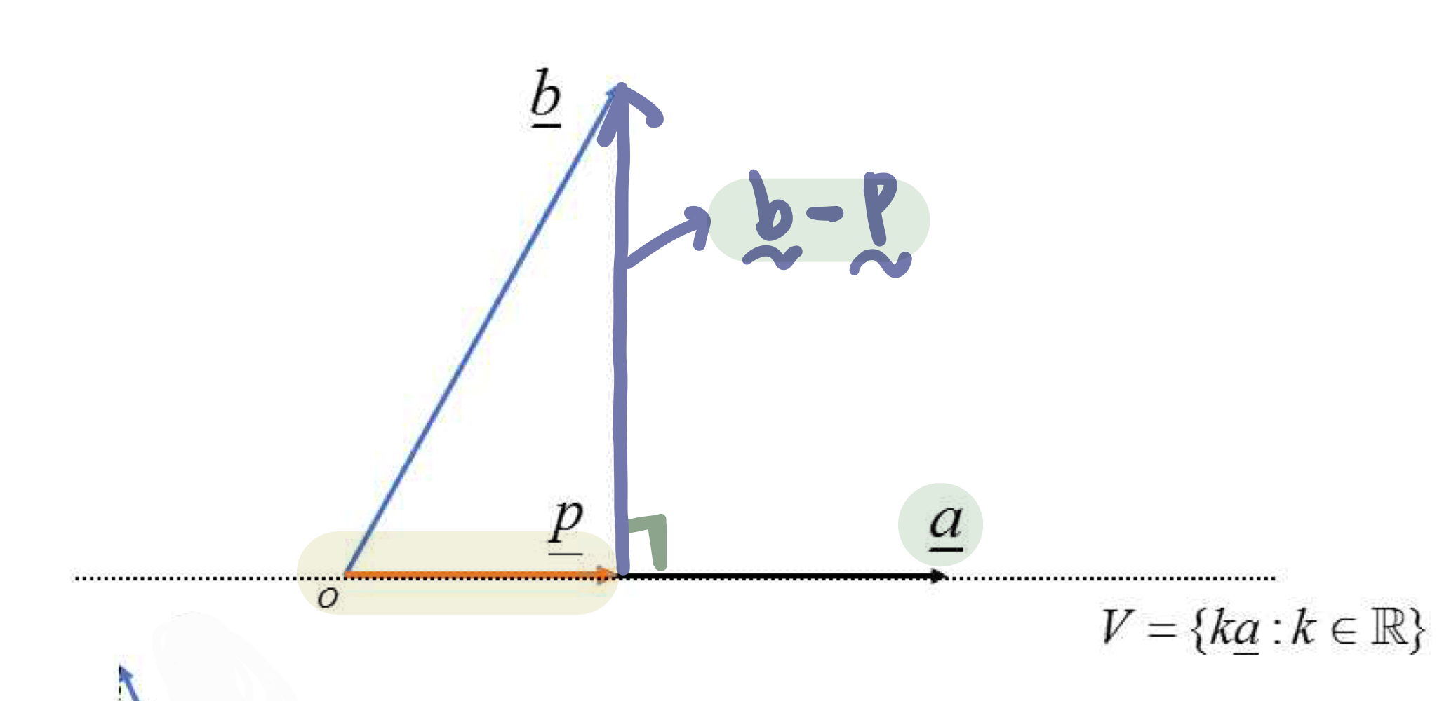 * 벡터 b의 평면 V 위로의 정사영 p
