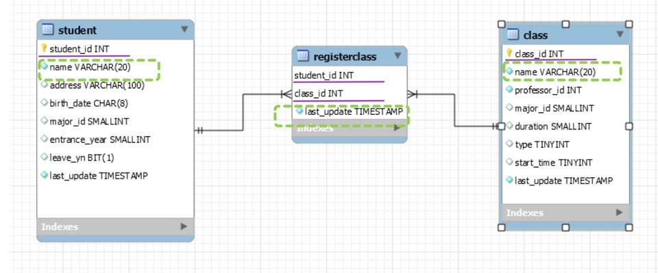 student테이블의 name과 class테이블의 name과 registerClass테이블의 last_update를 결합한다는 의미이다.