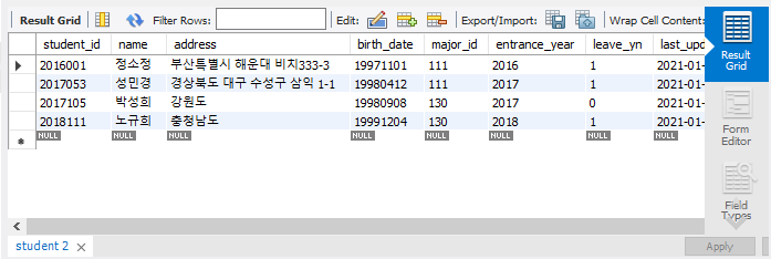 student_id, name, address, birth_date, major_id, enterance_year, leave_yn, last_update가 속성이다.