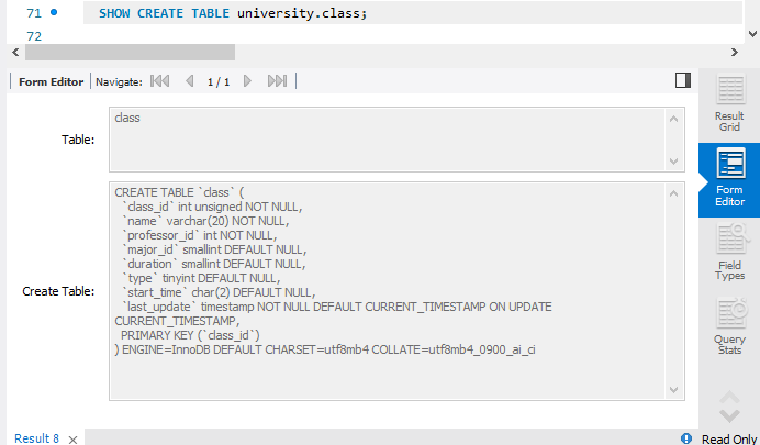 SHOW CREATE TABLE `university`.`class`;